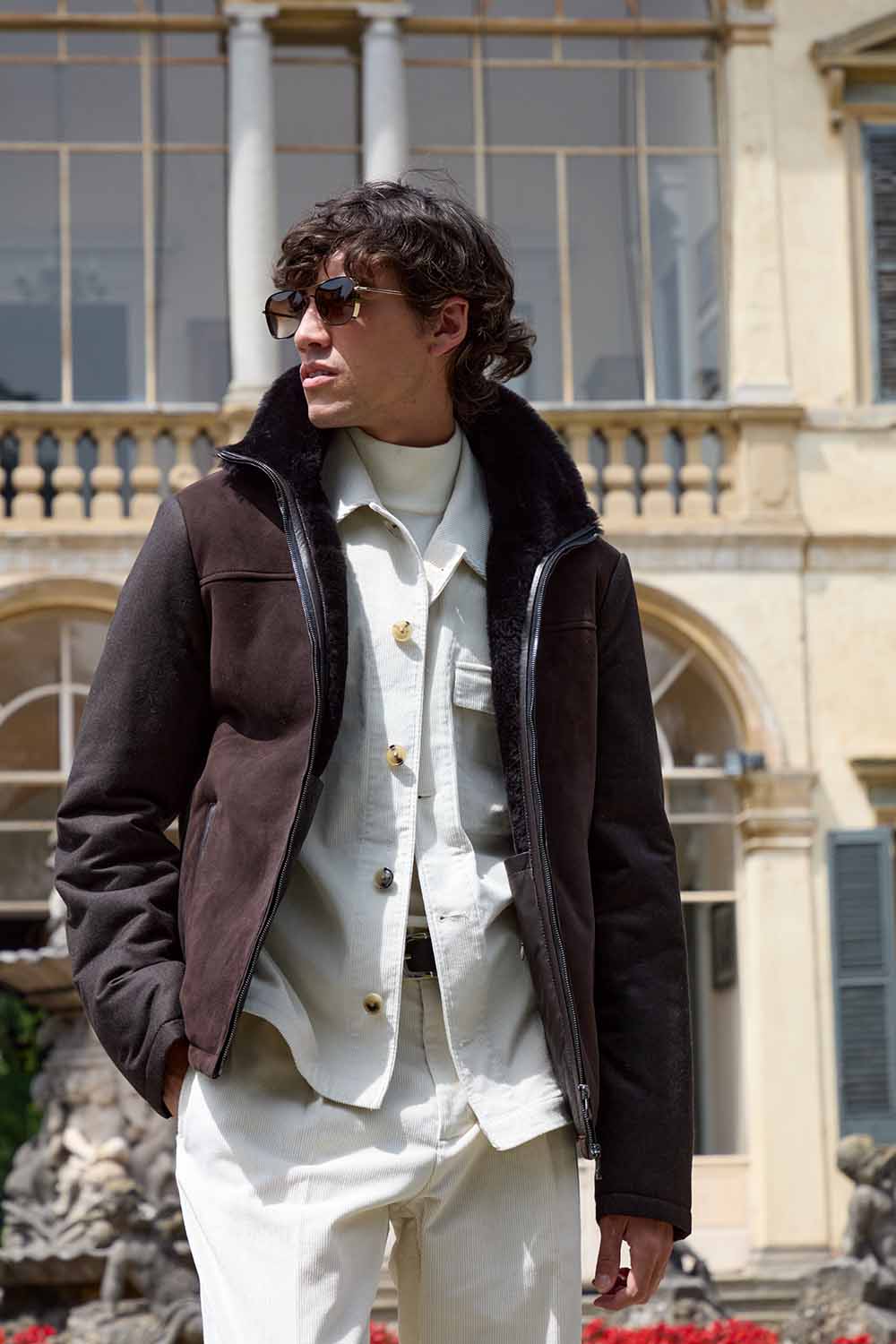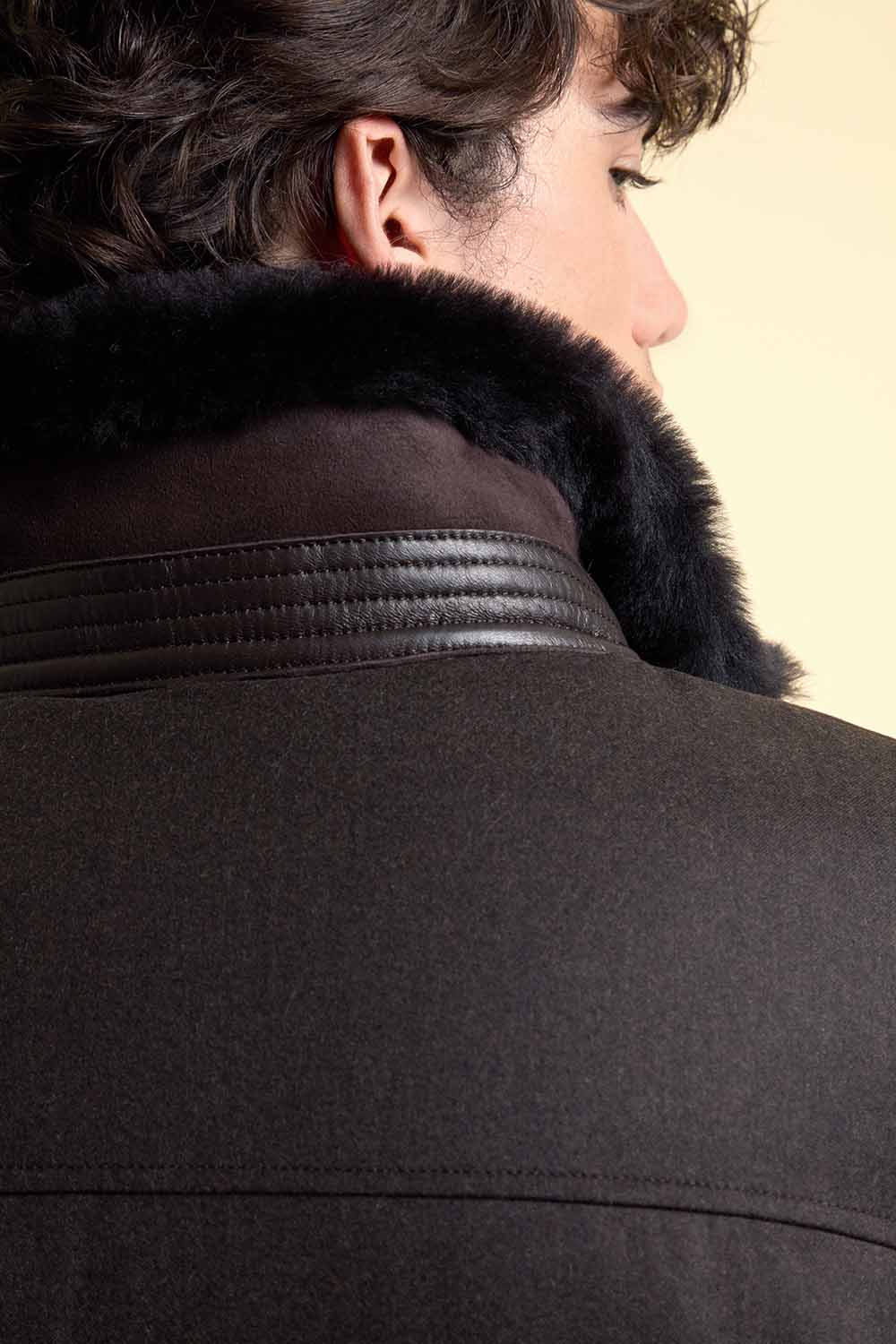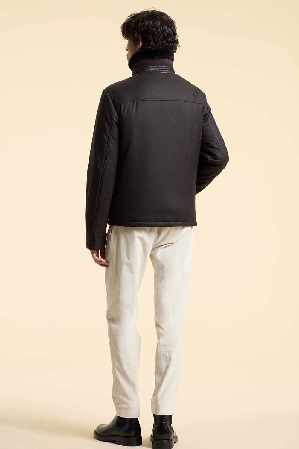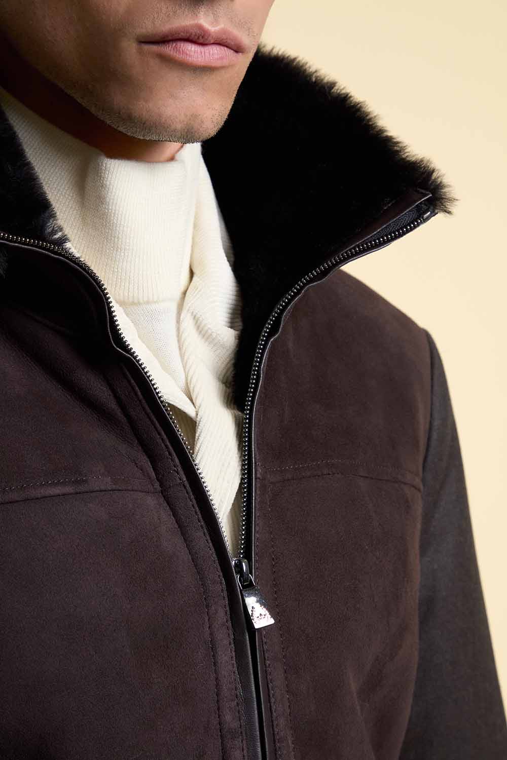 Questa giacca shearling uomo marrone slim fit unisce uno stile casual-chic alla funzionalità moderna. Progettata per garantire calore e stile, presenta un colletto e parte frontale in pregiata pelle di agnello entrefino spagnola, abbinati a maniche e schiena in tessuto cashmere e lana Loro Piana color marrone cioccolato.