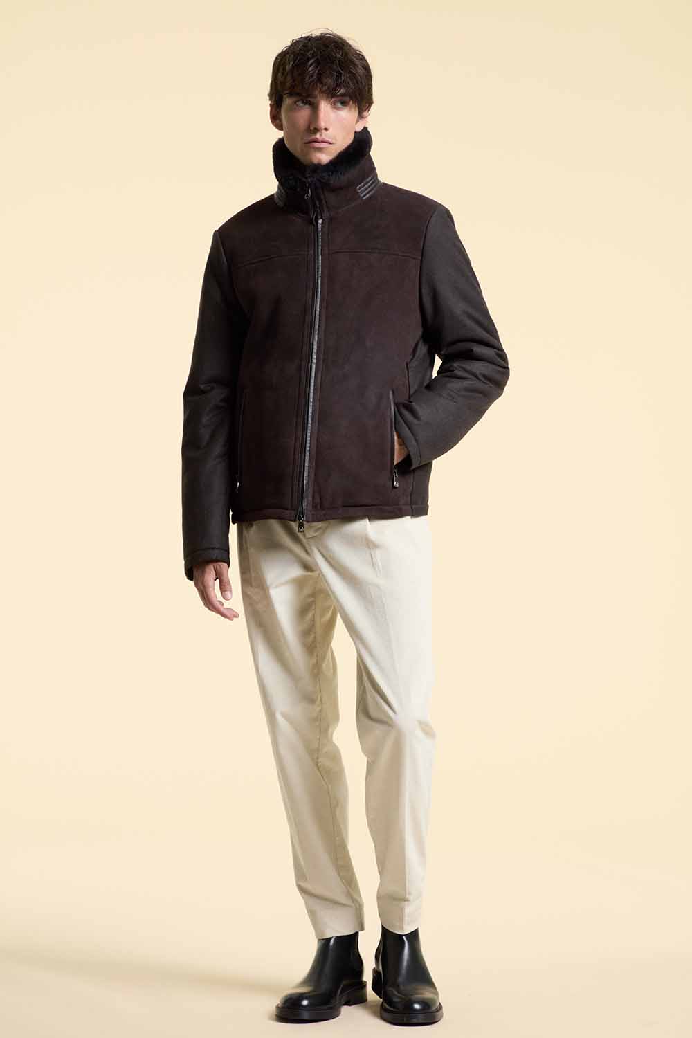 Collo alla coreana con shearling marrone scuro, inserti in pelle lungo la doppia zip, tasche verticali con zip e sul collo, 2 tasche interne |