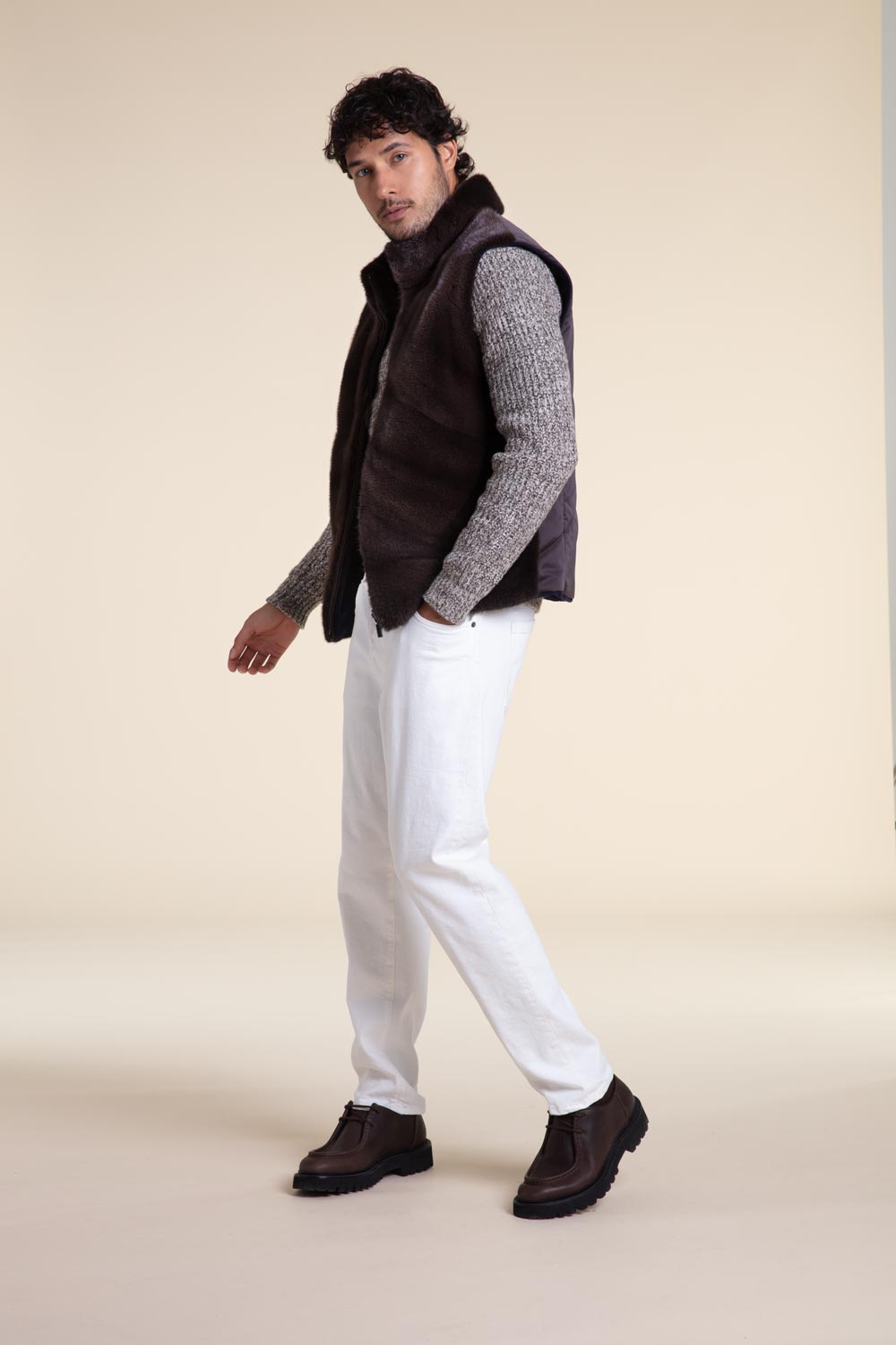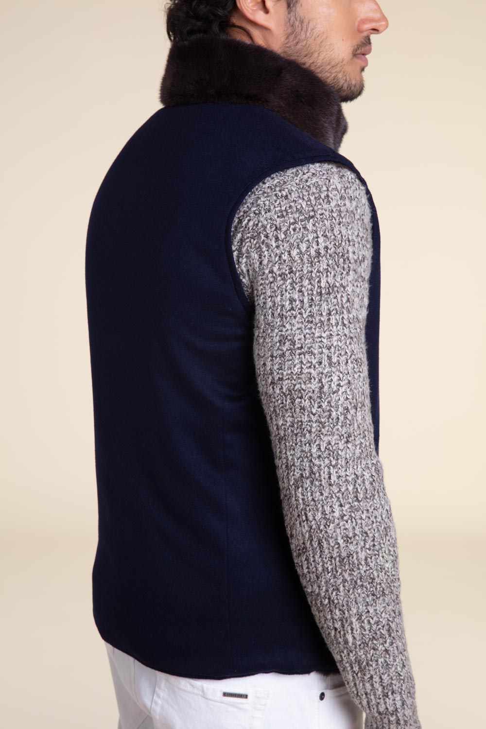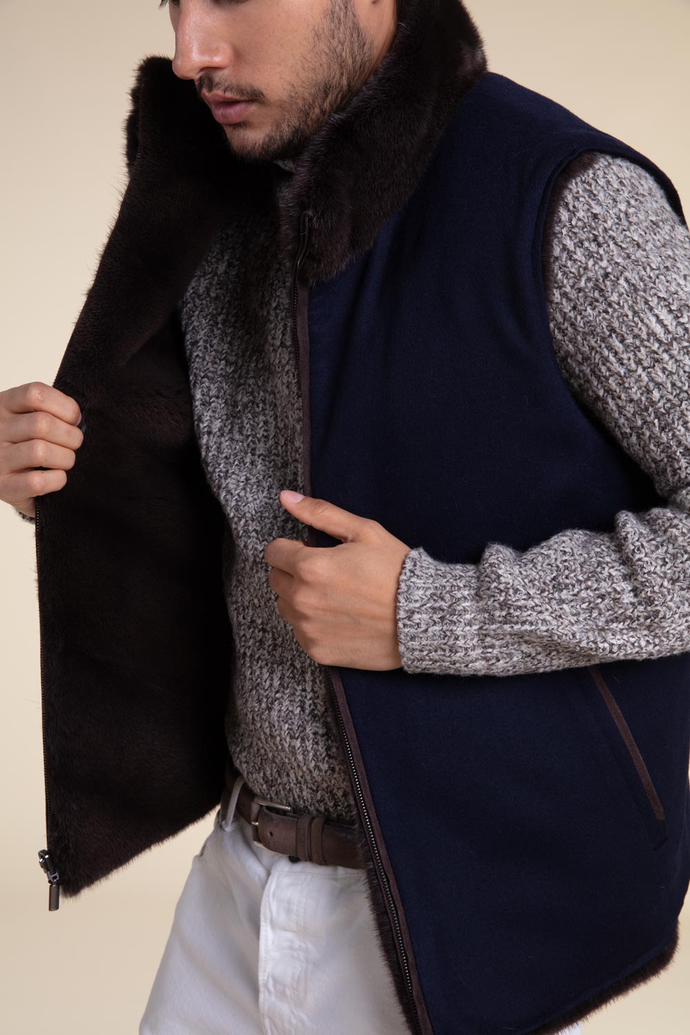 Gilet reversibile da uomo in visone e tessuto tecnico marrone sul retro. L’altro lato è in tessuto cashmere Loro Piana blu scuro. Il gilet ha un collo alto, una chiusura a zip e uno stile slim-fit. Offre un elevato livello di comfort e calore, ideale per affrontare le basse temperature invernali, poiché può essere indossato con la pelliccia all’interno. Un capo unico che permette di ottenere due diversi look.